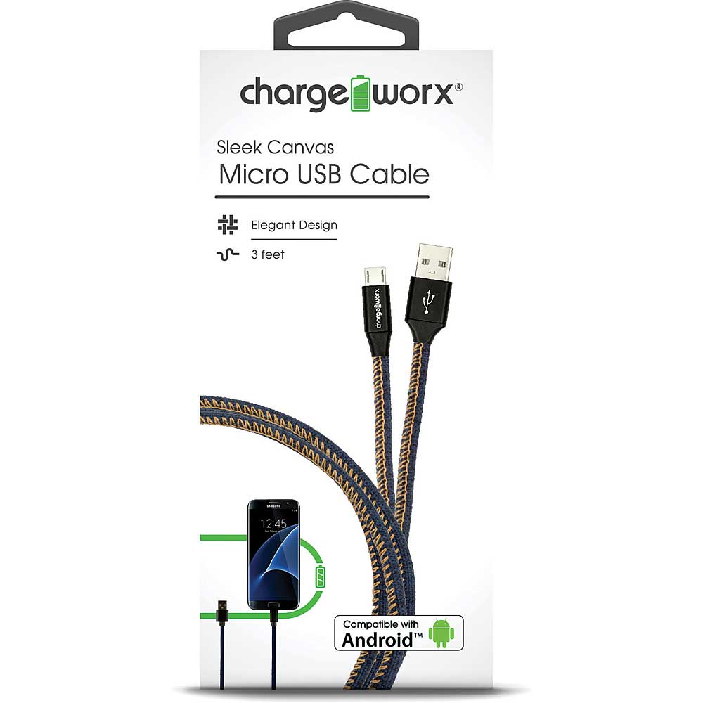 3ft Sleek Canvas Micro USB Cable, Blue VendorChargeworx Share WhatsApp Deel X Pin it Messenger Email Product form Out of stock SKU: CHA-CX4722BL Barcode: 643620009758 Charge any Micro USB cable compatible Device Tangle and scuff resistant Elegant Design 3 feet Pairs well with