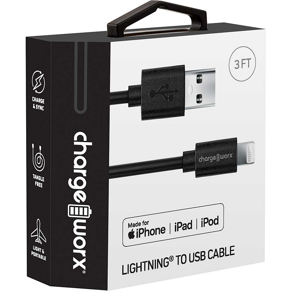 3 FT Lightning® to USB Cable, Black VendorChargeworx Share WhatsApp Deel X Pin it Messenger Email Product form In stock SKU: CHA-CX4884BK Barcode: 643620027868 Charge from any USB Port Sync Data at High Speed Tangle-free Construction Cable length 3ft /1m Pairs well with