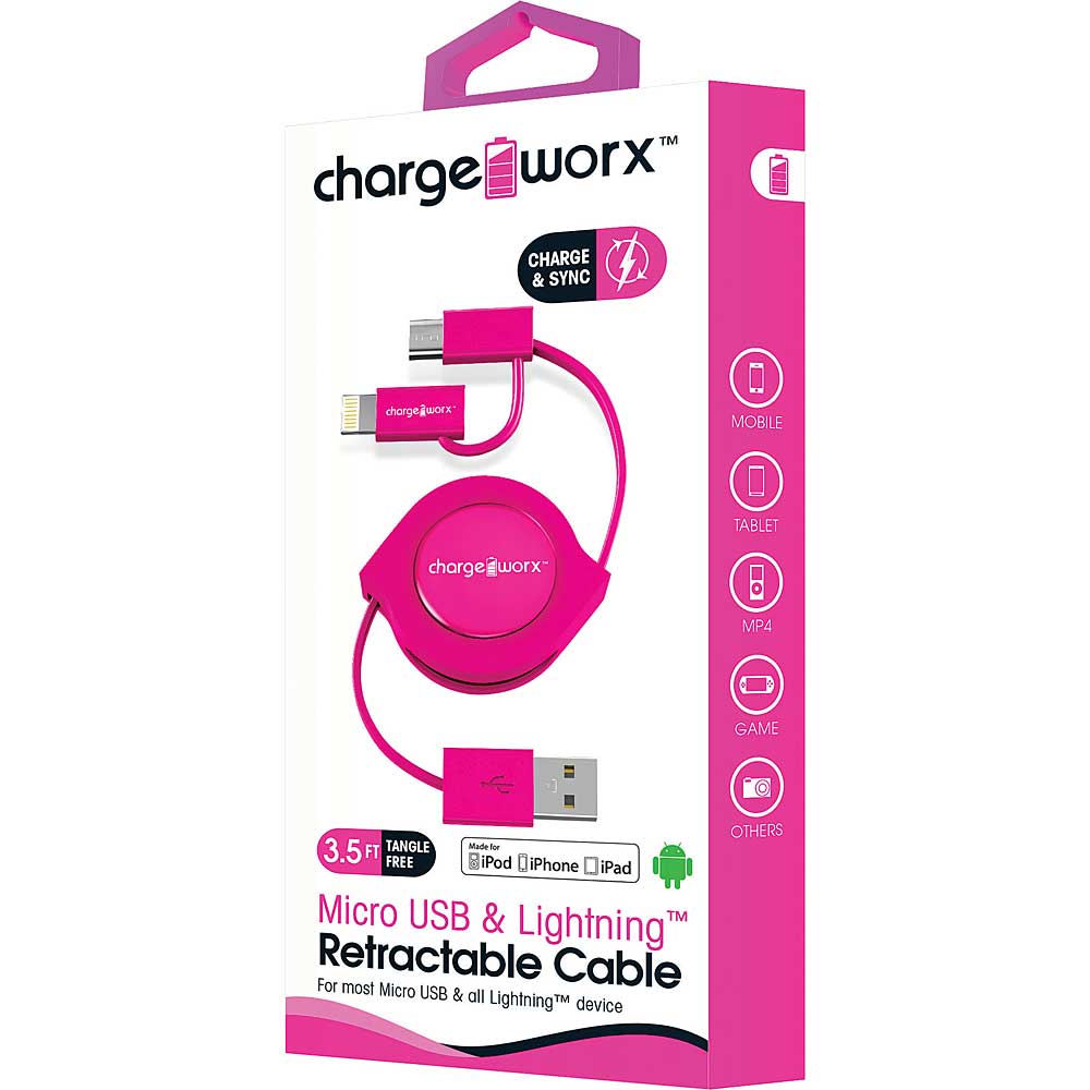 3Ft Micro+Lightning Retractable Cable, Pink VendorChargeworx Share WhatsApp Deel X Pin it Messenger Email Product form Out of stock SKU: CHA-CX5510PK Barcode: 643620551042 Charge from any USB Port Sync and charge capability Strong, durable cable design Pairs well with
