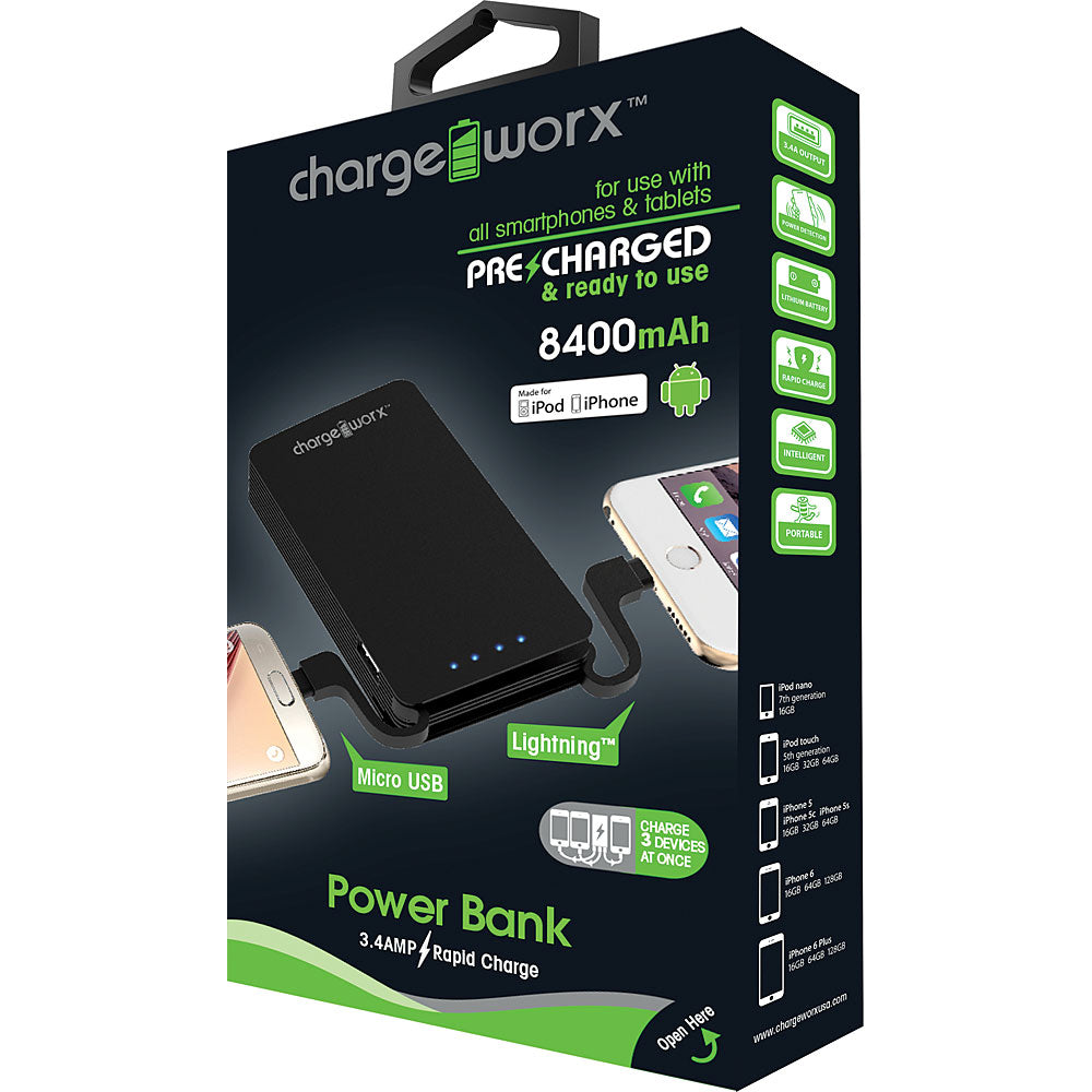 8400mAh Premium Power Bank with built-in Micro USB & Lightning Cable, Black