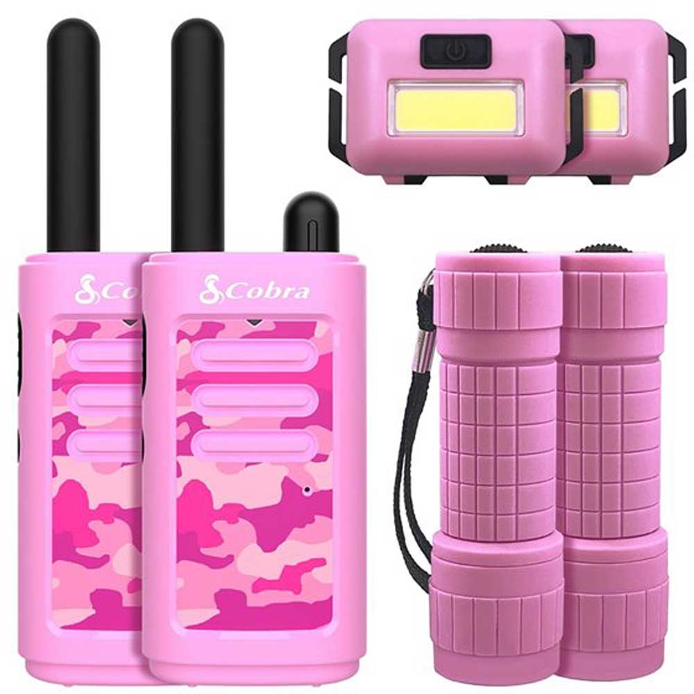 16-Mile Compact Two-Way Radio/Walkie Talkie with LED Flashlight & Headlamp Bundle, Pink