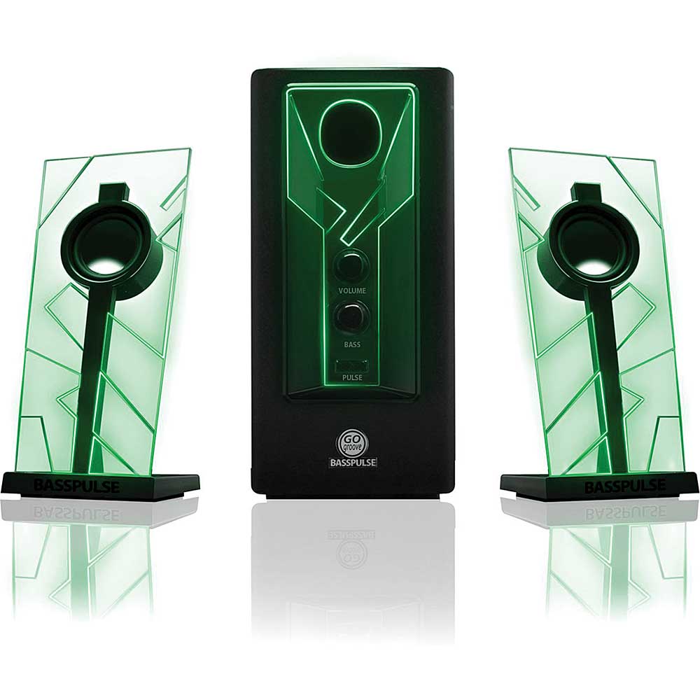 2.1 Stereo Speaker Sound System w/Powered Subwoofer, Green LED Glow Lights
