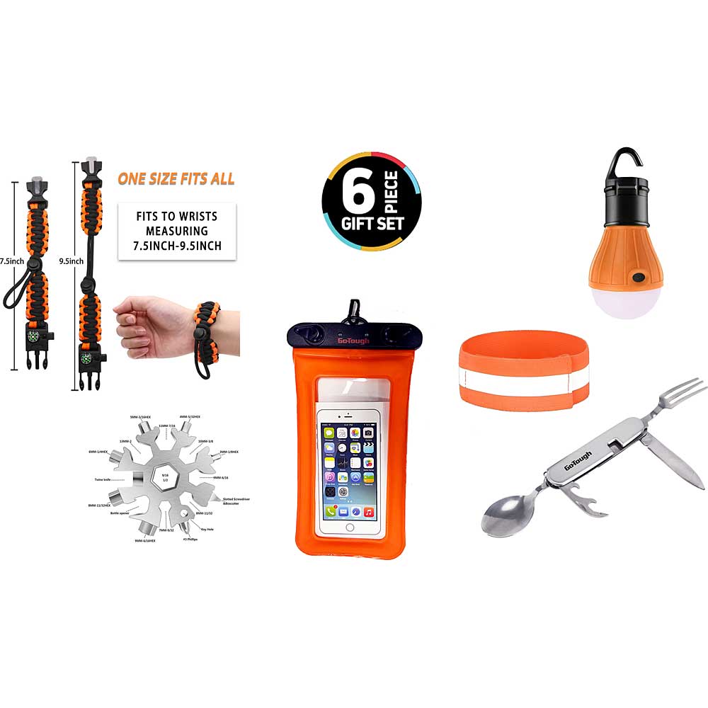 Stay overnight in the great outdoors with Go Tough's 6pc Overnight Camping Setup. Sleep safe under the stars with the 3 LED Mode Bright Tent Lamp, Floating Phone Dry Bag, Reflective Safety Arm Band, Multi-Functional Snowflake, Survival Bracelet, and 4-In-1 Utensil Set.