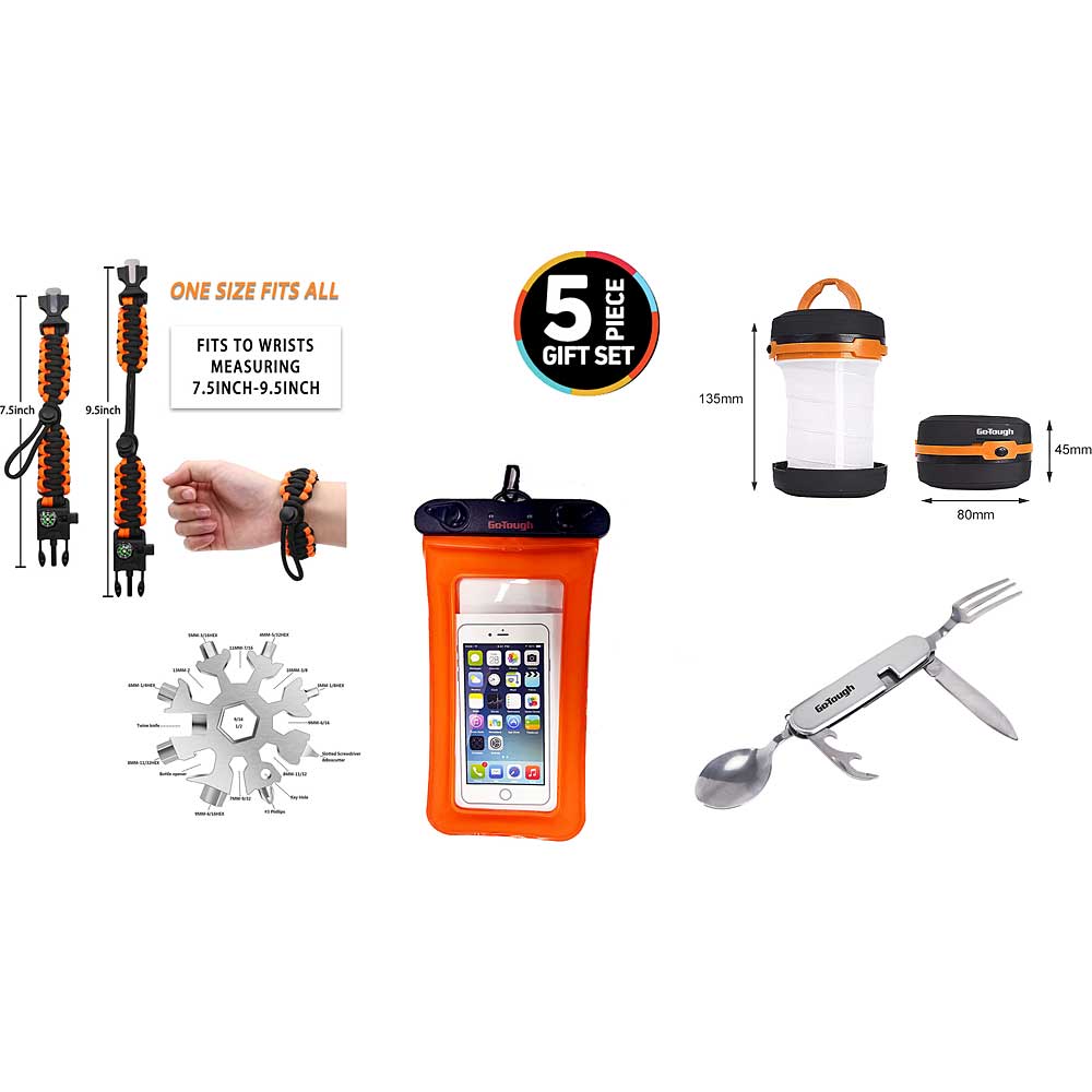 Set up shop out there in the wild with Go Tough's 5pc Stationing Set. Spend the night with the Collapsible Bright LED Lantern, Floating Phone Dry Bag, Multi-Functional Survival Bracelet, Utensil Piece, and Snowflake.
