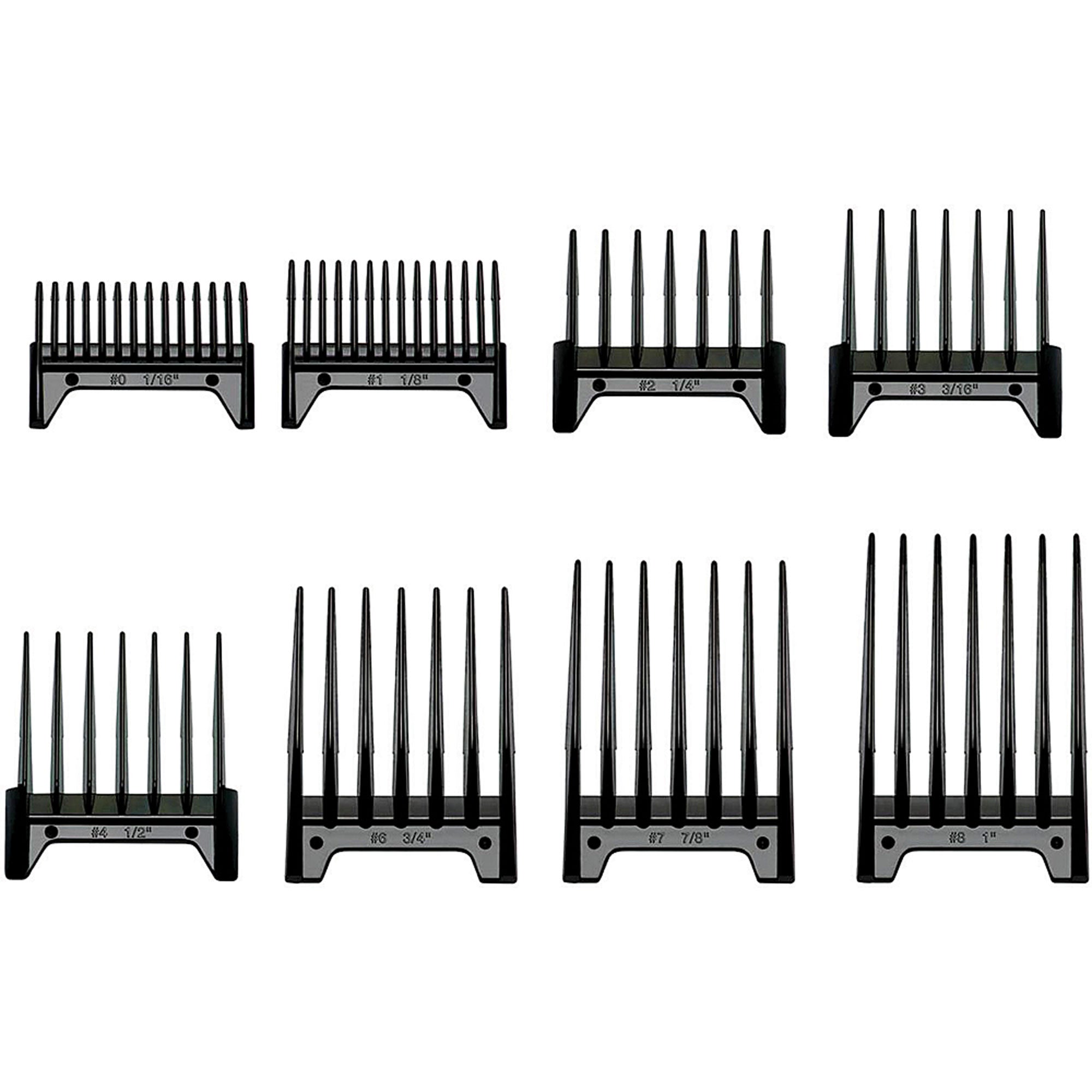 - Set Includes: #0 1/16" comb; #1 1/8" comb; #2 1/4" comb; #3 3/8" comb; #4 1/2" comb; #6 3/4" comb; #7 7/8" comb; #8 1" comb