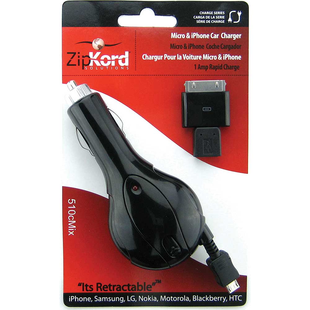 510CMIX Retractable Car Charger For iPhone & Micro USB VendorZipkord Share WhatsApp Deel X Pin it Messenger Email Product form In stock SKU: ZIP-510CMIX Barcode: 816281010603 Input: 100-240V AC Output: 1 Amp Charges iPhone, Blackberry, Android Pairs well with